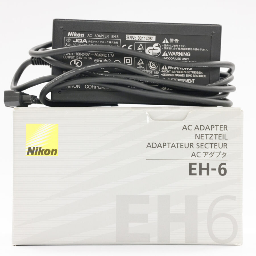 The Nikon EH-6 AC Adapter is a high-performance power supply designed to provide continuous, uninterrupted power to select Nikon professional DSLR cameras. It is primarily used for long studio sessions, time-lapse photography, or when downloading large amounts of data to a computer